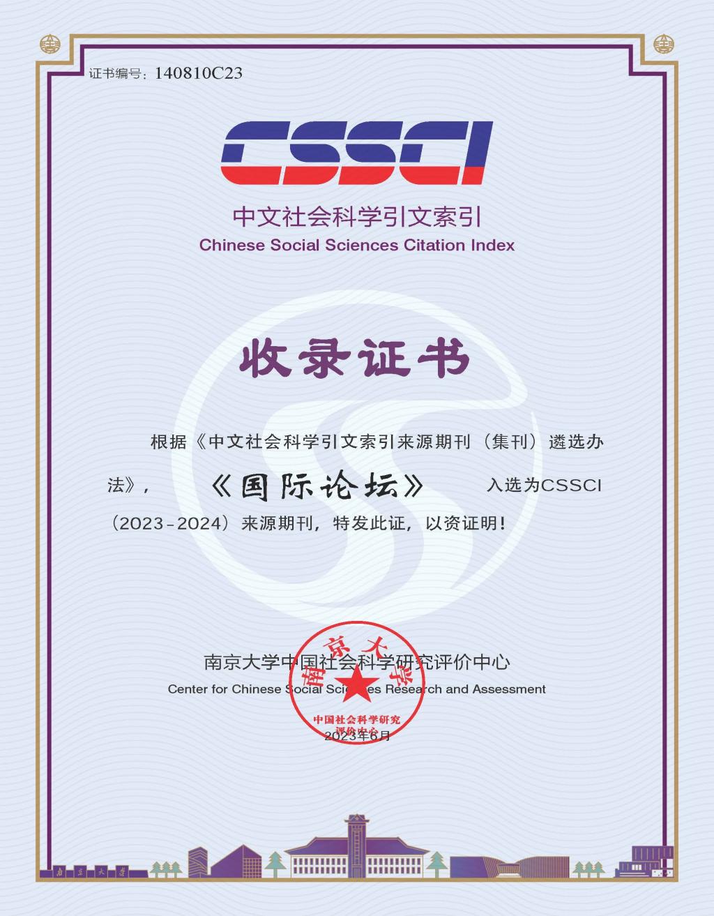 近日,编辑部收到南京大学中国社会科学研究评价中心来函,根据《中文社会科学引文索引来源期刊(集刊)遴选办法, 《国际论坛》入选为CSSCI(2023-2024)来源期刊。