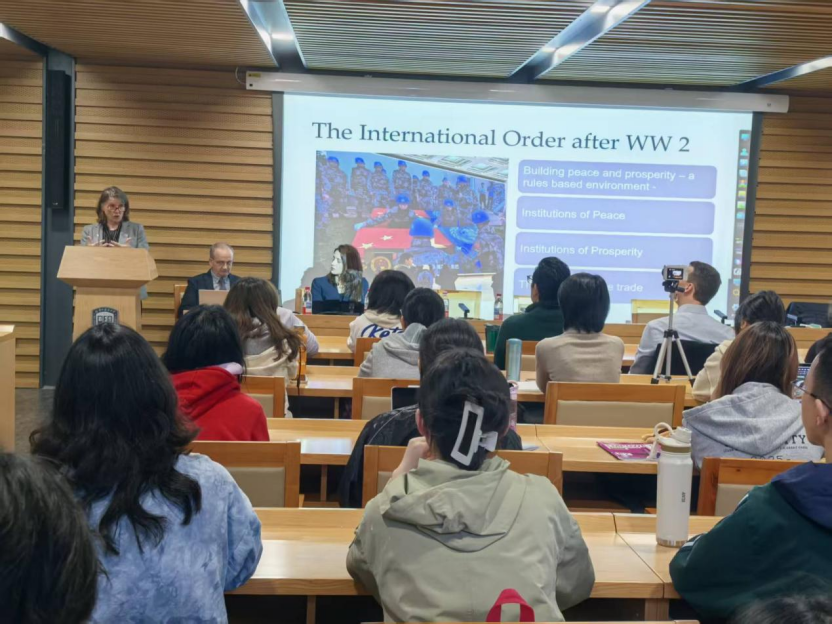 2025年10月17日上午,基尔大学副董事长唐娜·李(Donna Lee)教授、基尔大学教育公司经理丹尼尔·赫伯特(Daniel Herbert)教授以及基尔大学国际化与合作事务经理克里斯汀·布里尔(Kristen Brill)博士在北外举办了题为“特朗普对国际秩序的影响(The impact of Trump on the international order)的专题讲座。本次活动由bw必威西汉姆联官方网站经理谢韬教授主持,北外—基尔外交学合作办学项目2025级新生、项目外教以及bw必威西汉姆联官方网站的教师参加。