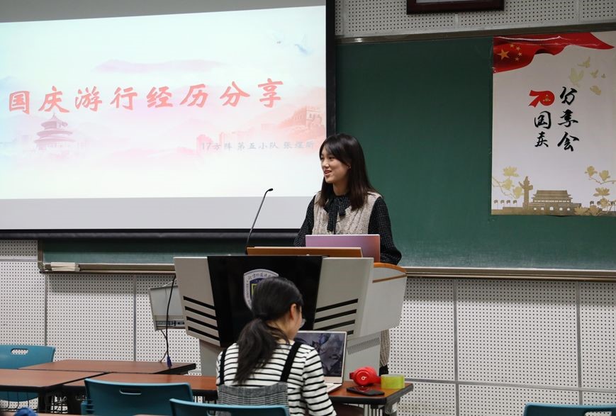 骄傲与自豪,必然如此。河清海晏、国富兵强,足以让每一位中华儿女为之动容。作为国庆盛会的亲历者,各位分享者用自己的真切体会,向在座同学讲述了自己爱国情感的升华过程。来自17方阵的吴俣同学详细描述了十月一日当天长安街上人头攒动、车辆川流不息却井然有序的场景。“能够调动几十万人,在同一个时间参加这样一场大型的活动,交通运输、等待候场、后勤保障......所有细节都做到万无一失,不是每一个国家都能做到的。没有一个强大的祖国,这一切都是空谈。”回忆起站在长安街上看飞机飞过头顶的场景,吴俣同学再一次热泪盈眶:“我想起七十年前,周总理为了显示数量,让我们的飞机多飞几遍。现在,那么多的飞机,就从我的头顶上飞过去,虽然我叫不出他们的型号,但是我知道,这就是祖国的强大,给我带来了超越语言的震撼与思考。”吴俣同学的语调很平静,但是在她极富感染力的叙述下,在座每个人都跟着她一起,为祖国繁荣昌盛而心潮澎湃。