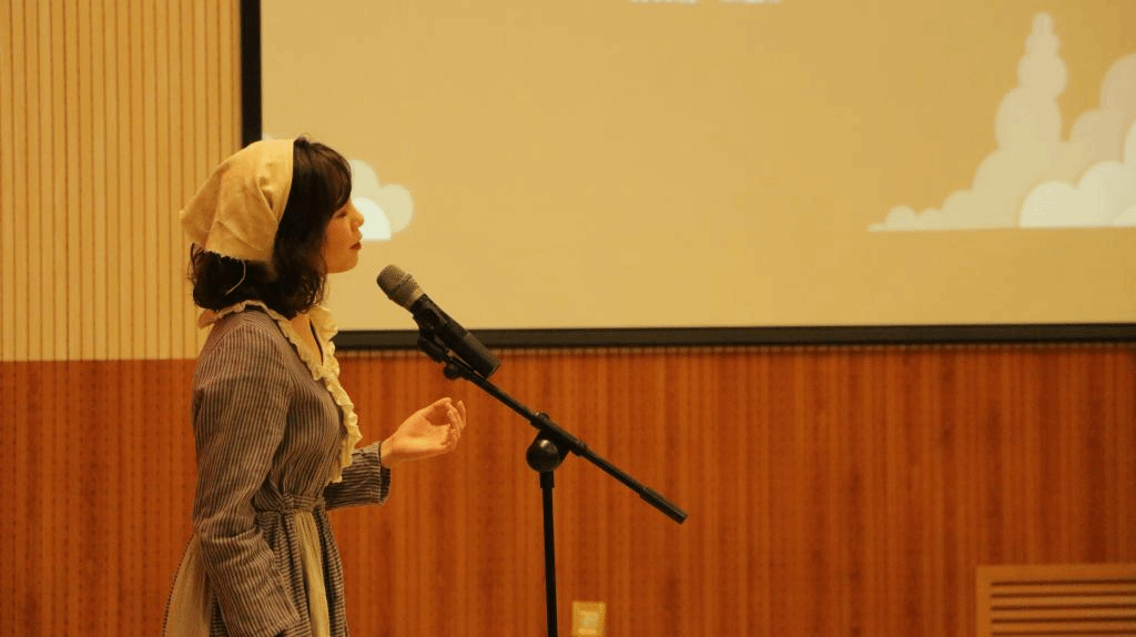 接下来的第二部分名为“异国”,语言是人类文化的载体,是珍贵的无形遗产。在这一部分,1903班王瀛彩同学首先为我们带来《悲惨世界》音乐剧中《I dreamed a dream》一曲,她将芳汀的哀悼表现得绘声绘色。第二个节目是由1907班白文丹同学带来的歌曲《what are words》。随后的表演,在1907班程怡伦的轻灵舞蹈下,1907班周子琳和郭子瑜同学演唱《city of stars》,为我们带来了一场视听盛宴。这一部分的最后由1905班同学和职工带来《Stopping by woods on a snowy evening》诗歌朗诵,将诗中忧伤里蕴含的对生命的沉思表现得淋漓尽致。