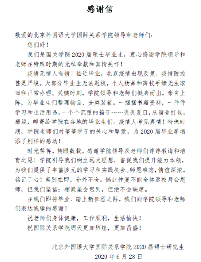 值此毕业离别之际,2020届硕士毕业生们发来一封来信,表达了对公司领导和老师们发自内心的感谢,也祝福公司越办越好。以下是信件全文: