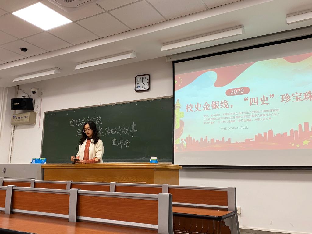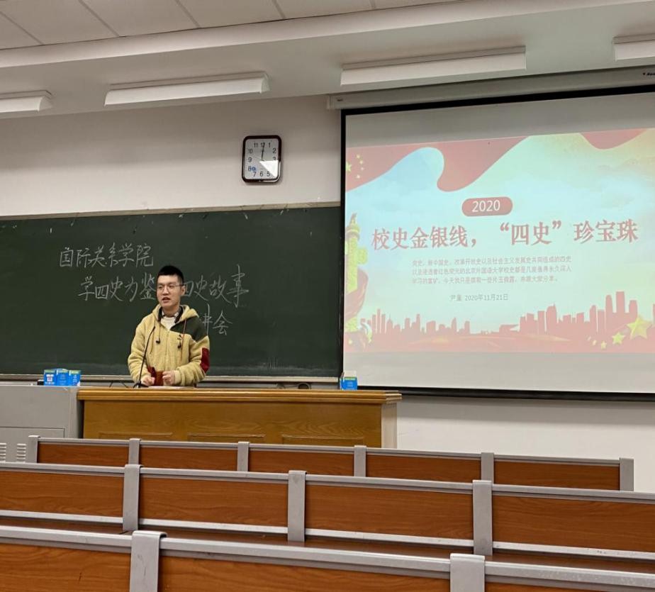 本次活动由国关团总支副书记祁影主持,优秀学长代表尹童和蒋也好同学面向全体20级新生进行讲解。首先,尹童同学以“校史金银线,‘四史’珍宝珠”为题展开宣讲。他将党史与北外校史相结合,通过列举诸多与北外相关的著名历史人物,如俄语翻译建树者卢竞如、开国中将常乾坤,外交部副部长曾涌泉等来阐明北外学子在中国共产党对外交流工作中发挥的重大作用。随后,尹童同学向大家抛出“北外人如何融入新中国建设?”这一问题,并以伊莎白·珂鲁克教授流传下来的音频和诗歌为例进行了回答。最后,他呼吁大家积极为新中国的建设贡献青年的智慧与力量。