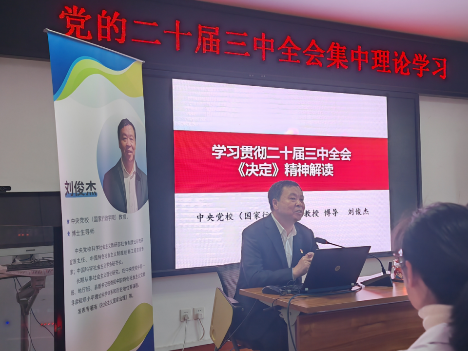 芦菊花书记首先对刘俊杰教授的到来表示欢迎。她指出此次讲座旨在深入解读全会精神,凝聚改革共识,激发奋斗热情,具有很强的理论性和指导性意义。