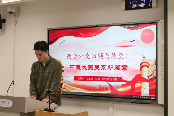 随后,杜秋卓同志聚焦外交部部长王毅在记者会上的重要表态,深入研判了我国外交政策的立场主张、应对策略与务实举措,并结合个人研究方向,分享了他对中俄关系的见解。他认为,中俄关系在多个领域取得了重要进展,特别是在高层交往、经济合作、军事协作以及国际事务中的协调等方面,展现出高度的活跃性和稳定性,成为大国关系的典范。