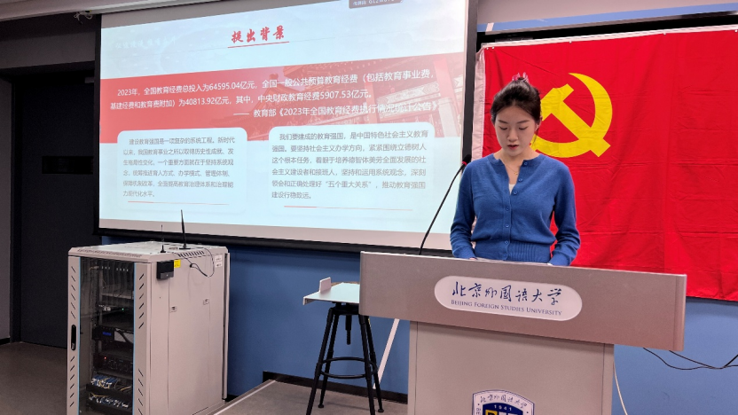 活动伊始,张方琼宇同志以教育强国思想的核心要义为主线,聚焦“坚持党的全面领导、落实立德树人、坚持以人民为中心、一体推进教育科技人才发展”四项原则,结合外交学科特点与员工视角,从“把牢政治方向、夯实德智体美劳全面培养、践行为民宗旨、拓展全球胜任力、强化科技赋能”五个维度,系统梳理了教育强国战略对外语外交人才培养的路径。她提出,要将教育强国的宏伟蓝图细化为课堂学习、科研训练、国际实践的具体行动,号召青年员工在知行合一中成长为堪当民族复兴重任的高素质外交人才。