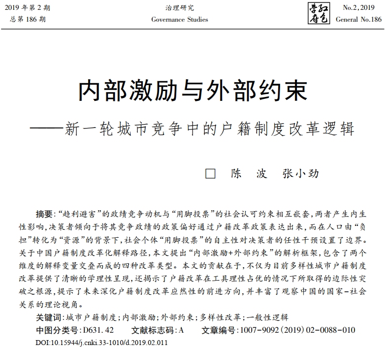bw必威西汉姆联官方网站教师陈波以第一作者在CSSCI期刊《治理研究》发表论文:《内部激励与外部约束——新一轮城市竞争中的户籍制度改革逻辑》,论文摘要和原文链接如下: