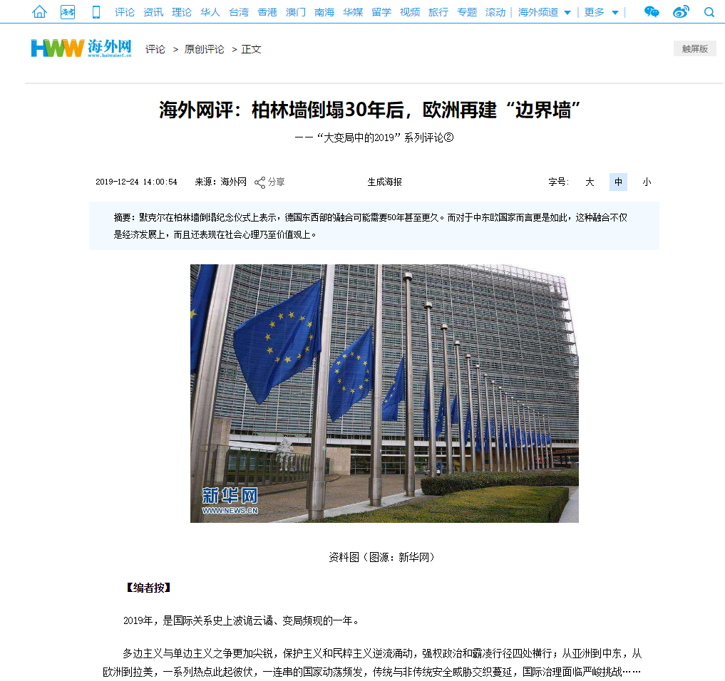 bw必威西汉姆联官方网站王明进副经理作为海外网特约评论员发表文章,题目是《柏林墙倒塌30年后,欧洲再建“边界墙”》。该文是海外网推出的年终系列国际评论,“回望‘大变局中的2019’”的第2篇。海外网致力于打造中国在海内外具有重要影响力的新媒体国际传播平台,第一时间向读者提供中国热点、国际时政,特别是涉华国际新闻事件的权威解读。以下是文章题头截图、摘要和文章原文地址。